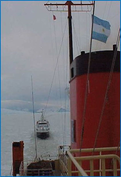 Este dramático y temido cambio de escenario debido a una impredecible y desafortunada combinación de factores climáticos era el que estaba produciéndose mientras el Clipper Adventurer se adentraba más y más en el Estrecho de Matha, convirtiendo aquel paraje en una verdadera trampa de hielo. Su posición era 66º 43’ de Latitud Sur y 67º 31’ de Longitud Oeste. Al verse rodeado de hielo compacto ordenó detener las máquinas, por temor a repetir el incidente que se había producido en el viaje anterior (daño a las palas de la hélice), concluyendo rápidamente que para salir de aquel atolladero necesitaría de la ayuda de un rompehielos especialmente diseñado para navegar en medio de un mar congelado. Hacia finales del mes de enero, el rompehielos A.R.A. “ALMIRANTE IRIZAR” (RHAI), al mando del Capitán de Fragata D. Eugenio Luis Facchin, se encontraba navegando en la Antártida al sur de la isla Amberes para efectuar tareas de balizamiento y oceanografía. A poco de llegar se ordenó un vuelo glaciológico por el Canal Lemaire, el cual puso sobreaviso a la estación científica norteamericana Palmer acerca de la presencia del RHAI. Este vuelo resultó a la postre providencial dado que fue el hecho que determinaría horas más tarde que el personal de Palmer Station pudiera retransmitir al CA la presencia en el área del rompehielos argentino tras enterarse de la crítica situación en la que se encontraba. A las 07:55 de la mañana de aquel 31 de enero, el Jefe de Operaciones del RHAI, Teniente de Navío Marcelo Tarapow, un veterano oficial en navegación antártica con cinco campañas en su haber, atendió personalmente el llamado de auxilio del Capitán del CA por INMARSAT dando cuenta de su comprometida situación y de la imposibilidad de propulsarse por sus propios medios.