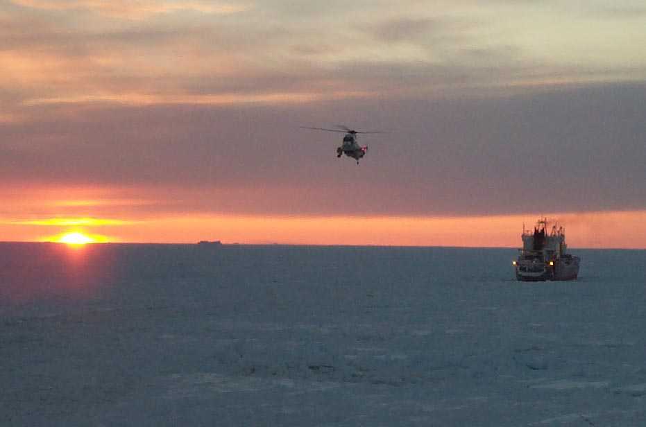 Durante esta etapa de la navegación, se hizo un uso permanente de los helicópteros efectuando vuelos de observación glaciológica en busca de la mejor ruta. Estos vuelos, para que sean de provecho, no deben alejarse de la unidad de superficie más allá de 15 Mn y deben realizarse de acuerdo con una planificación previa, que surge de la observación de las imágenes satelitales y del asesoramiento experto de los glaciólogos.